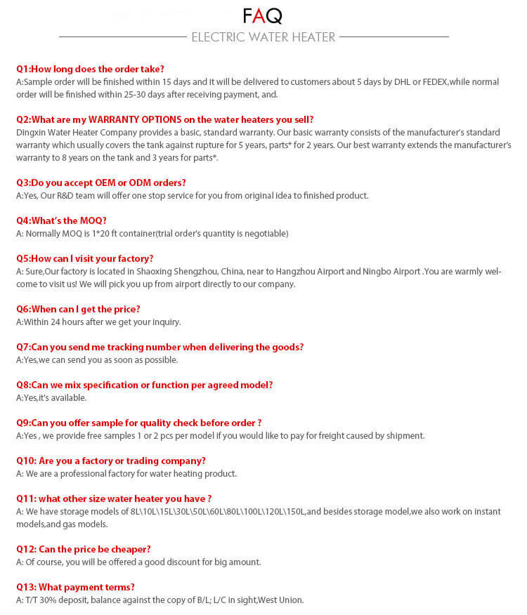 • OEM/EXPORT: We are proud to supply water heaters to various brands in the heating industry all over Europe,South America,South asia. OEM is an important part of our business because it inspires and motivates us to think innovatively, be flexible in our approach and challenge traditional mind-sets.